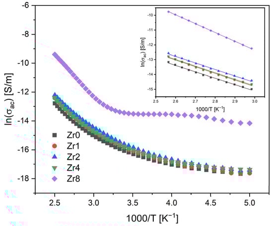 Figure 4 shows the AC conductivity versus 1000/T on a semi-logarithmic scale. In general, two main mechanisms can contribute to the conductivity of glasses: ionic and electronic. In the case of glass ceramics, the presence of crystalline phases and phase boundaries can significantly affect conductivity [37,38]. The concentration and distribution of these crystalline phases can alter the local electric field and influence the motion of the charge carriers. This is because the conductivity will be different depending on whether the charge carriers are in a glass or crystalline environment.