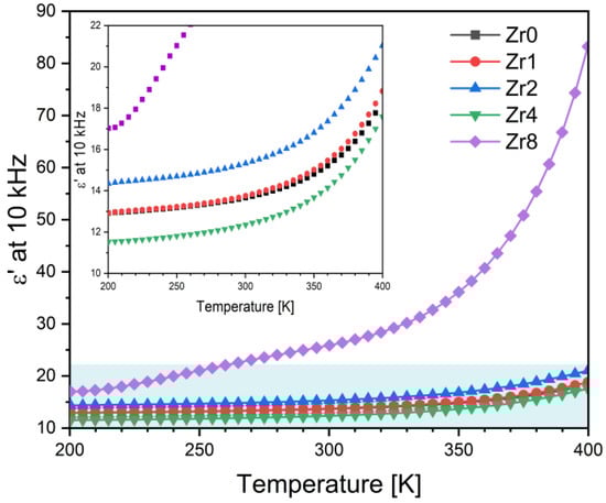 The dielectric constant, ε’, as a function of the temperature of the Bioglass samples modified by ZrO2 insertion at 10 kHz (the inset is the magnification of the blue rectangle region).