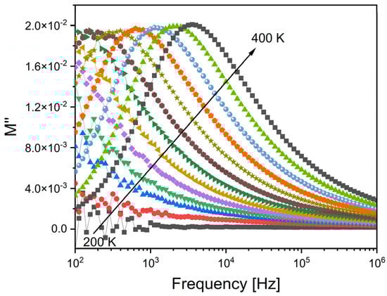 The analysis of the dielectric properties of the samples was then conducted using the modulus formalism, M*, which is defined as 1/ε*, and gives the advantage of mitigating the influence on the dielectric data from low capacitance contributions, like electrode polarization and also low-frequency conductivity [40]. The obtained results, as depicted in Figure 6, indicate the presence of a single dielectric relaxation process that shifts towards higher frequencies as the temperature increases. Notably, alternative approaches like permittivity or impedance or admittance did not reveal the presence of this dielectric relaxation behavior. Hence, it can be inferred that the relaxation phenomenon observed is associated with an inherent characteristic linked to the formation of dipoles between the network modifier ions and the non-bridging oxygen ions present structurally in their vicinity.