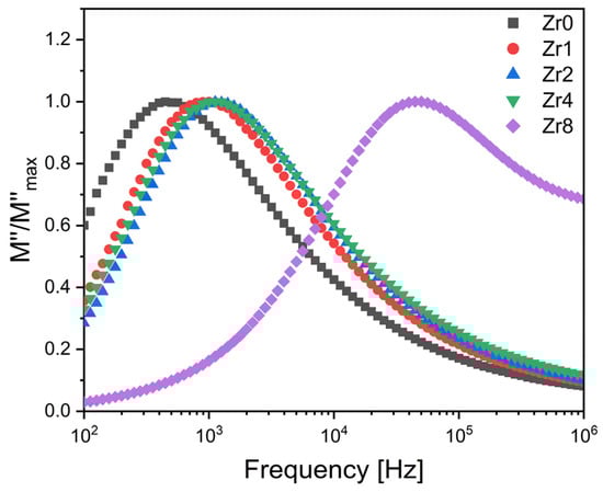 A comparison of normalized imaginary parts of the electric modulus M″/M″max as a function of frequency at different concentrations of ZrO2 inserted into the Bioglass network is presented in Figure 7. The results obtained show a slight shift in the electrical modulus relation peak to a higher frequency when increasing the concentration of zirconium from 0 to 4 mol%, suggesting a decrease in the relaxation time and thus an increase in the charged species and dipoles from the glass matrix. Furthermore, it can be observed that increasing the zirconium concentration to 8 mol% leads to a significant shift in dielectric relaxation towards the high-frequency range. This significant shift could be due to the alteration of the mechanisms responsible for this relaxation phenomenon. According to the literature, we propose that this relaxation can be attributed to the dipoles present in both the crystallites and the crystal–glass interfaces [25].