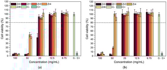 Relative viability of (a) non-passivated and (b) passivated Bioglass extracts modified by ZrO2 in culture with Saos-2 cells. C+ and C− represent the positive control (cells in a cytotoxic environment) and negative control (viable cells).