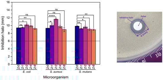 Measurements of inhibition halo diameter of the Bioglass samples against E. coli, S. aureus, and S. mutans bacteria after incubation for 24 h. The results are reported as the mean ± SD. The asterisks indicate significance in an unpaired t-test; * p ≤ 0.05; ** p ≤ 0.01; **** p ≤ 0.0001, ns: nonsignificant. The image on the right side is an example of an assay plate illustrating the inhibition halo of the Zr2 pellet on S. aureus.