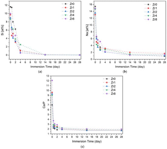 To assess the ability of the bioactive glasses to promote new bone formation and integration with the host bone, an in vitro test was conducted to evaluate the formation of an apatite layer when the material is immersed in simulated body fluid (SBF). This method provides insight into the physicochemical reactions occurring at the surface of the Bioglass in a biological medium. The formation of an apatitic layer is critical for osteoblast cell adhesion and proliferation [50]. Figure 10 shows the variation in the Si and Na atomic percentages and the Ca/P ratio, evaluated by EDS analysis on the surface of the Bioglass pellets after immersion in SBF for various time intervals. Upon contact with SBF, the bioactive glass undergoes a reaction mechanism involving an ionic exchange between the sample and its surrounding medium. First, the alkali and alkaline earth ions (Na+ and Ca2+) on the glass surface are exchanged with H+ and H3O+ ions in the medium, resulting in an increase in pH. This increase in pH values facilitates the breakdown of Si-O-Si bonds in the glass network, which accelerates the dissolution of the glass and leads to the formation of silanol units (Si(OH)4). These silanol units condense on the glass surface to form a hydrated silica layer, which acts as a nucleation site for the growth of a carbonated hydroxyapatite layer which will subsequently crystallize [51,52].