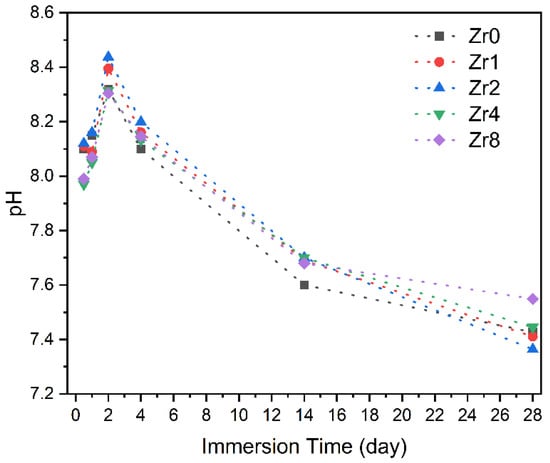 After immersion, the pellets were removed from the SBF medium, gently cleaned with deionized water, and dried at room temperature. The samples were analyzed using SEM/EDS to determine the change in the ion concentration and the formation of an apatite-like layer on the surface over 28 days with the presence of a different percentage of zirconium.
