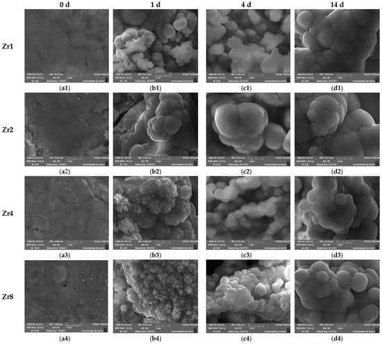 SEM micrographs of the Bioglasses containing various concentrations of ZrO2 after immersion in SBF for: (a1–a4) 0 d; (b1–b4) 1 d; (c1–c4) 4 d; (d1–d4) 14 d. (The magnification of the SEM images is 10 kX).