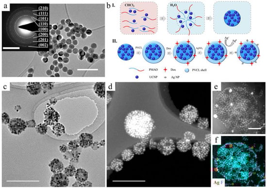 (a) TEM images of as-synthesized core/shell NaYF4:Yb3+/Tm3+@NaYF4 UCNPs (scale bar - 100 nm) and selected area electron diffraction pattern of UCNPs on insert (scale bar - 5 nm−1). (b) Schematic illustration of the rational design of multifunctional UCNP complexes: I.—step 1: PMAO hydrocarbon moiety interaction with oleate ligand on the surface of UCNP in organic solvent; PMAO self-assembly into large spherical micelles with several UCNPs intercalated in the micelle core after transfer into water; crosslinking of large spherical micelle with diamine to form stable polymer particles (UCNP–PMAO); II.—step 2: UCNP–PMAO modification with PVCL; step 3: embedding the therapeutic agents; step 4: Ag+ adsorption on the UCNP–PMAO–PVCL surface, followed by reduction; (c) TEM and (d) HAADF–STEM image of UCNP–PMAO–PVCL complexes. Scale bar is 500 nm; (e) HAADF–STEM image and (f) EDX elemental mapping of UCNP–PMAO–PVCL containing in situ-formed Ag NPs. Scale bar is 200 nm.