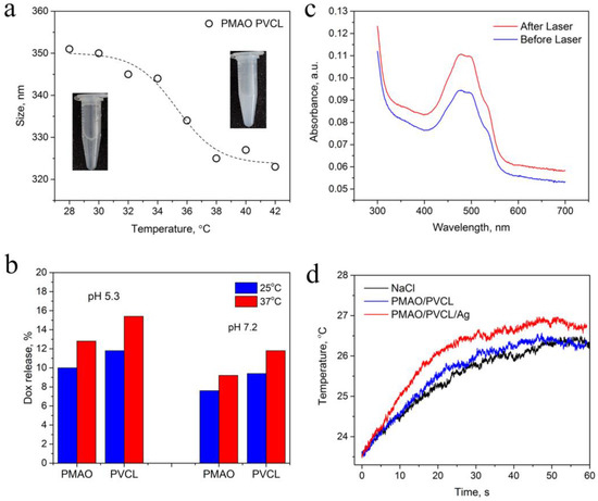 The photothermal functionality of the designed complex is associated with resonant NIR light absorption in UCNPs. The absorption cross-section of Yb3+ ions is sufficient to cause local overheating of a surrounding media with cytotoxic effects on cells and tissues [13]. Photothermal functionality can be enhanced through drug encapsulation into the complex. The 980 nm laser light irradiation of the Dox-loaded UCNP–PMAO–PVCL complex induced UCNP heating, shrinkage of PVCL, and drug release (Figure 2c). The UCNP–PMAO–PVCL complex was decorated with Ag NPs to increase the heating rate. The heating rate difference between the complex decorated with Ag NPs and the Ag-free complex became evident in the first 20 s of NIR light exposure (Figure 2d). Additionally, we acquired changes in the absorption spectrum of Dox after Ag NP addition, manifested by an increase and a blue shift in the Dox absorption peak at 490 nm, indicating a change in the chemical environment that can be addressed to Dox–Ag NP assembly (see S4).