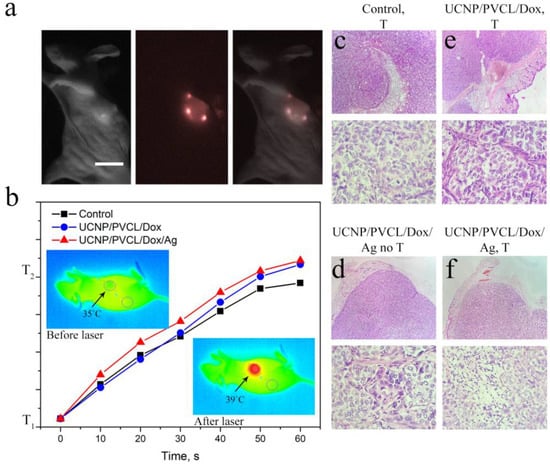 (a) In vivo images taken after 1 h UCNP–PMAO–PVCL complex injection: bright-field (left), epi-luminescent (center), and overlay (right) images. Scale bar 1 cm. (b) The rate of tumor heating depending on the injected complex; inserts—temperature images of mice before and after 980 nm laser treatment demonstrate tumor overheating. (c) Histological images of the tumor tissue sections stained with hematoxylin and eosin after the 980 nm laser treatment, negative control group; (d) after UCNP–PMAO–PVCL–Dox complex injection with 980 nm laser treatment; (e) after UCNP–PMAO–PVCL–Dox–Ag NP complex without 980 nm laser treatment; and (f) UCNP–PMAO–PVCL–Dox–Ag NPs with 980 nm laser treatment. Top images—magnification 40×; bottom images—magnification 400×.