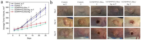 The evaluation of the antitumor effect of the complex was accompanied by the whole-animal visualization (Figure 4a) using a custom-developed epi-luminescence imaging system capable of detecting 800 nm emission from UCNPs under 980 nm laser excitation [51]. Sk-Br-3 cells 5 × 106 were administrated into the flanks of Balb/c nude mice to induce tumor formation (for details, see M&M section). The experiment was started on the 10th day after inoculation when the average volume of tumors reached 70 ± 10 mm3. The complexes were administrated peritumorally (50 µL suspension, 0.8 mg/mL, single dose). Local overheating was employed after 24 h of the complex administration. NIR laser irradiation without complex injection was used as a negative control. The actual temperature of mice was monitored by a Xenics Gobi-384-GigE-7098 camera in real time. Tumors were treated with 980 nm pulsed laser light for an average of 3 min until the temperature difference between the tumor and untreated tissue reached 4 °C (Figure 4b). The rate of tissue heating depended on the injected sample. In the case of UCNP–PMAO–PVCL, the temperature was the same as in control (without UCNP) in the first few seconds but started to increase by an average of 1 °C after 1 min from the start of NIR laser treatment. As expected, the maximum heating rate was detected for the complex decorated with Ag NPs.