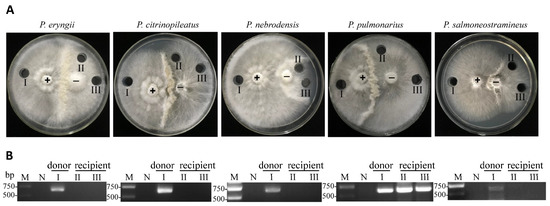 Co-cultivation of OMSV-positive (+) Pleurotus ostreatus and OMSV-free (−) Pleurotus spp. (A) Co-culture of the donor strain with replicate C1021 of P. eryngii, replicate Y055 of P. citrinopileatus, replicate BN18 of P. nebrodensis, replicate XH2208 of P. pulmonarius, and replicate TH20901 of P. salmoneostramineus. (B) RT-PCR detection of OMSV in different inocula. OMSV-free strains were used as negative controls (N). M, DNA Marker2000.