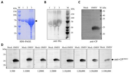 The OMSV-CP gene was amplified by PCR with primers CPNdF/CPSaR (Table S1) and ligated with a prokaryotic expression vector pDB.His.MBP to obtain pDB.His.MBP-OMSV-CP. The recombinant plasmid was transformed into Escherichia coli BL21 (DE3) and induced by 0.1 mM isopropyl-beta-D-thiogalactopyranoside (IPTG). Cultures were grown at 16 °C with shaking for 16 h. Then, the cells were collected by centrifugation at 4000× g for 10 min, resuspended in high-salt buffer (20 mM Tris-HCl, 500 mM NaCl, pH 8.0), and disrupted by sonication. The supernatants were applied to a Ni-affinity column, and the recombinant protein was eluted with elution buffer (20 mM Tris-HCl, 150 mM NaCl, 100 mM imidazole, pH 8.0). The purified protein was analyzed through SDS-PAGE electrophoresis.