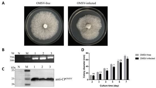 Morphology of isogenic strains of Pleurotus pulmonarius after 7 days of incubation. (A) Healthy P. pulmonarius with regular morphology. OMSV-infected stain showing some extreme sectoring. (B) RT-PCR detection of OMSV used to verify the virus transmission. N, negative control, the healthy P. pulmonarius strain; M, DNA Marker2000. (C) A Western blot of OMSV used to verify the virus presence. Lane M, molecular weights of protein marker. (D) The growth rate of OMSV-free and OMSV-infected isogenic strains of P. pulmonarius. The independent sample t-test was performed between the OMSV-free and OMSV-infected isogenic strains (ns, not significant; * p < 0.05; ** p < 0.01).