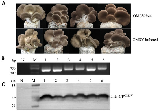 The performance of fruiting bodies affected by OMSV infection in Pleurotus pulmonarius. (A) Morphological observation and comparison of fruiting bodies of the OMSV-free and OMSV-infected strains. RT-PCR (B) and Western blot (C) detection of OMSV in fruiting bodies of both strains. Numbers 1–6 represent six biological replicates. The healthy P. pulmonarius sample was used as negative control (N). Lane M (B), DNA Marker2000. Lane M (C), molecular weights of protein marker.