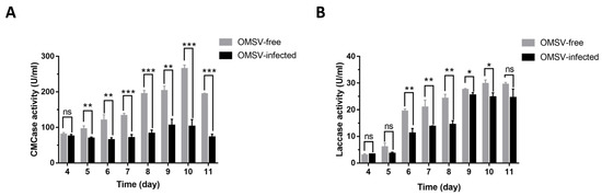 Enzyme activity of OMSV-free and OMSV-infected Pleurotus pulmonarius strains during mycelial growth. (A) CMCase activity; (B) laccase activity. Numbers 4–11 indicate days of liquid mycelial growth. Asterisks indicate significance determined by independent sample t-test, * p indicates significant difference at <0.05, ** indicates significant difference at p < 0.01, and *** indicates significant difference at p < 0.001; ns, not significant.