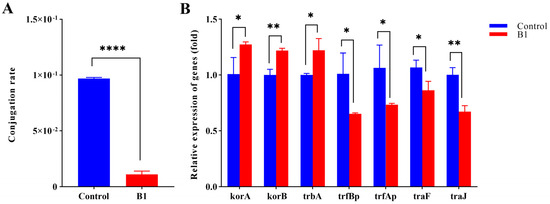 Effect of the CRISPRi system on the plasmid RP4 conjugation rate (A) and the mRNA expression level of global regulator genes (korA, korB and trbA) and conjugation-relevant genes (trbBp, traF, trfAp and traJ) (B). Control refers to E. coli HB101 (RP4+plv−dCas9−B0), and B1 refers to the strain with plv−dCas9-B1. All data represent the means ± standard error of mean of biological triplicates. Asterisks indicate significant differences between results for the control and B1 strain (*, p < 0.05; **, p < 0.01; ****, p < 0.0001).