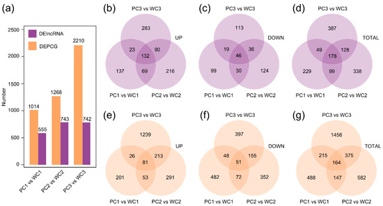 Defining DElncRNAs and DEPCGs between white and purple Tibetan hulless barley seed coats among three developmental stages. (a) The number of DElncRNAs and DEPCGs in Nierumuzha at three different developmental stages compared to Kunlun 10 (|log2FC| values ≥ 1; p value ≤ 0.01; q value ≤ 0.05). (b–d) DElncRNAs (upregulated, downregulated, and total) between purple and white hulless barley along the developmental gradient. (e–g) DEPCGs (upregulated, downregulated, and total) between purple and white hulless barley along the developmental gradient.