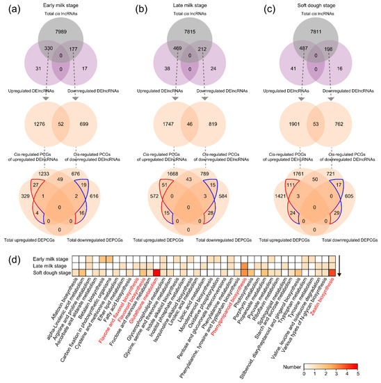 As PCGs located near lncRNAs often indicate the potential biological functions of lncRNAs, we investigated the metabolic processes related to cis-regulated DEPCGs of DElncRNAs. In Figure 4d, we focused on tertiary metabolism terms and found that the metabolic patterns enriched in cis-regulated DEPCGs of DElncRNAs varied along the seed developmental gradient. As hulless barley developed, there was a gradual emergence of DEPCGs in metabolic pathways, with the highest number of DEPCGs associated with “glutathione metabolism”, “phenylpropanoid biosynthesis”, and “zeatin biosynthesis metabolic pathways” at the soft dough stage. Furthermore, we documented the presence of “flavonoid biosynthesis” downstream of the phenylpropanoid pathway (Figure 4d). Thus, DElncRNAs played a role in the complex metabolic processes involved in hulless barley seed coat development, particularly in relation to phenylpropanoid and flavonoid biosynthesis.