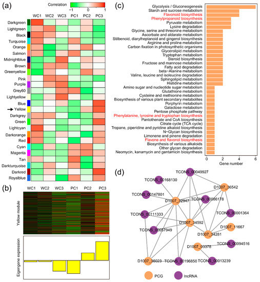 Co-expression network of trans-regulated lncRNAs and their PCGs in Tibetan hulless barley seed coats. (a) Investigation of module-trait correlations. Each row shows a module, and each column represents different developmental stages of hulless barley. Red represents a positive correlation, and green represents a negative correlation. The module marked by black arrow is potential color-forming modules. (b) The eigengene expression heatmap for the color-forming module (“yellow” module). (c) Metabolic function enrichment of PCGs in PC3 of the “yellow” module. (d) The correlation network of trans-regulated hub-lncRNAs and their hub-PCGs involved in phenylpropanoid and flavonoid biosynthesis (kME = 0.8; GS = 0.8).