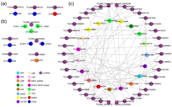 Transcription factors associated with cis- and trans-regulated lncRNAs. (a) Cis-regulated DETFs and their DElncRNAs in the early milk stage. (b) Cis-regulated DETFs and their DElncRNAs in the soft dough stage. (c) Possible trans-regulated lncRNA-TF interaction correlation network of the color-forming module. The different color points represent different transcription factor families.