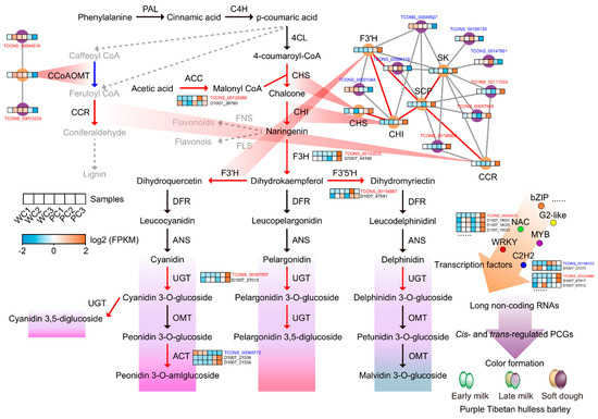 Dynamic molecular mechanism portrait of the anthocyanin synthesis pathway illustrating the color formation of Tibetan hulless barley seed coats. The red line represents the higher PCG expression level at the soft dough stage in purple Nierumuzha relative to white Kunlun 10. The blue line represents a much lower level of expression. Both cis- and trans-regulated lncRNAs that are consistent with the expression pattern of their target PCGs are written in red font, and those that are not consistent with the expression pattern of their target PCGs are written in blue.