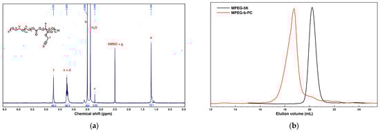 Functional amphiphilic block copolymer (MPEG-b-PC) characterization via (a) 1H NMR (600 MHz) spectroscopy in DMSO-d6; (b) GPC in tetrahydrofuran vs. polystyrene narrow molar mass standards.