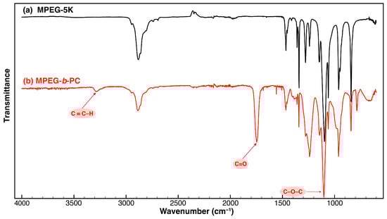 FTIR spectra of (a) MPEG-5K macroinitiator; (b) the corresponding functional amphiphilic diblock copolymer (MPEG-b-PC).