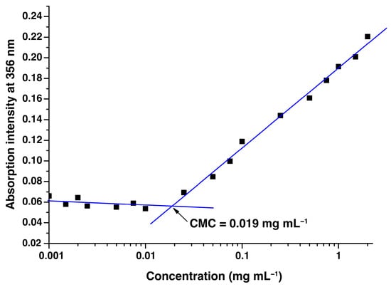 An important parameter characterizing the supramolecular aggregates’ thermodynamic stability is the so-called critical micelle concentration (CMC), i.e., the concentration above which the aggregates are spontaneously formed. In order to estimate the CMC of the functional amphiphilic MPEG-b-PC diblock copolymer, a spectroscopic dye solubilization method was applied [43]. A series of copolymer aqueous solutions/dispersions with increasing concentrations in the presence of the hydrophobic dye DPH were prepared. The onset and the increasing of the dye solubilization into the micelles’ hydrophobic core were detected and followed by UV/Vis spectroscopy. The block copolymer CMC value was estimated from the curve presented in Figure 3.