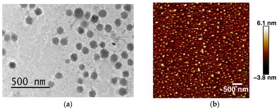 The block copolymer micelles’ morphology was visualized via transmission electron microscopy (TEM) (Figure 5a) and atomic force microscopy (AFM) (Figure 5b).