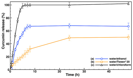 Initially, the curcumin release profiles were obtained using a dialysis membrane in order to separate the micelles dispersion from the aqueous release media containing drug solubilizing additives (Figure 6a,b). In cases when various amounts ranging from 2 to 20% (v/v) of ethanol were used to solubilize the released Curc, it was noticed that the drug remains trapped onto the membrane surface resulting in an incorrect release profile. Therefore, in order to prevent the adsorption and enhance the permeation of the drug across the dialysis membrane, the amount added to the release media ethanol was increased to 50% (v/v) (Figure 6a). However, the addition of such an amount of ethanol changed significantly the composition of the release media. In another experiment, 1% (w/v) Tween® 20 was added to the aqueous release media, and no traces of curcumin retention onto the dialysis membrane were observed. The corresponding Curc release profile is presented in Figure 6b. Alternatively, the drug release profile was obtained by non-mixing with water organic solvent (chloroform) as a release media, thus avoiding the use of a dialysis membrane (Figure 6c). However, the so-called biphasic dissolution model is rarely used for drug release evaluation since there is a possibility of micelles’ dissolution at the water/organic solvent interface, leading to increased values for drug release [45]. All three profiles obtained under different conditions showed a burst drug release during the first hours of evaluation. In the case of the biphasic dissolution model, the whole amount of the encapsulated drug was released after 8 h, most likely due to a gradual micelle dissolution, as already discussed (Figure 6c). In the cases when aqueous release media were used, the first stage was followed by a sustained drug release (Figure 6a,b). The initial burst drug release followed first order-like kinetics might be due to the release of curcumin located on the periphery of the micelles’ core, close to the hydrophilic shell. The water/ethanol system showed fast initial drug release, reaching 68% of the released Curc for 48 h. The fast-release kinetics could be attributed to the micelles’ core swelling caused by the presence of 50% alcohol in the system (Figure 6a). On the contrary, just 28% of Curc was released from the micelles in aqueous media containing 1% Tween® 20 after 8 h, followed by a much slower and sustained drug release reaching 50% for 48 h (Figure 6b). Since the water/Tween® 20 system contains only a 1% solubilizing additive, it might be the most relevant for the Curc release evaluation. According to the results obtained, most of the drug would be safely preserved in the core of the micelle during the nanocarrier systemic circulation. However, the results from any in vitro drug release evaluation should be interpreted with caution since they are strongly dependent on the release media and the solubilizing additives used.