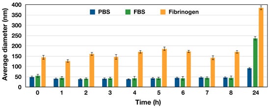 A more noticeable increase in micelles’ diameters was detected after 24 h of incubation but was still below 200 nm. Similar evaluations were performed in two other biologically simulated proteins (FBS and fibrinogen) containing media. The potential protein adsorption estimation is important since if it takes place, it could lead to nanocarriers’ disassembly and untimely drug release during systemic circulation. The FBS solution did not affect block copolymer micelles’ sizes after 8 h of incubation (Figure 7). In the case when the drug-loaded micelles were incubated in the fibrinogen solution, somewhat bigger particles were formed from the initial time of mixing. Although some fluctuations in micelles’ diameters were detected after 8 h of incubation, they did not exceed 200 nm (Figure 7). After 24 h, both FBS and fibrinogen-incubated micelles significantly increased their diameters apparently due to protein adsorption. Nevertheless, it has been already shown that the maximum level of accumulated PEG coated micelles into the tumor tissue via the EPR effect, which is typically achieved within 6 h after their intravenous injection [46]. Consequently, the curcumin-loaded block copolymer micelles (MPEG-b-PC/Curc) demonstrate stability in biologically simulated media and might be suitable candidates for further in vitro and in vivo evaluations as safe nanocarriers of hydrophobic drugs.
