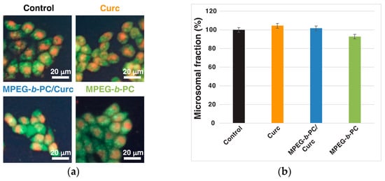 Furthermore, no significant effect on the morphology of cells treated both with empty (MPEG-b-PC) and curcumin-loaded (MPEG-b-PC/Curc) block copolymer micelles compared to the untreated control cells was observed (Figure 10a). The difference between the acridine orange (AO, green to red)-stained microsomal fraction of treated and untreated (control) cells was found to be in the 5–7% range (Figure 10b). This negligible effect, as well as the low degree of cytotoxicity, suggests that both the empty and curcumin-loaded block copolymer micelles are biocompatible and do not affect the cellular metabolism of the evaluated normal cell line. The results obtained indicate that the functional copolymer micelles display protective properties and are promising candidates for further investigation as nanocarriers for biomedical applications.