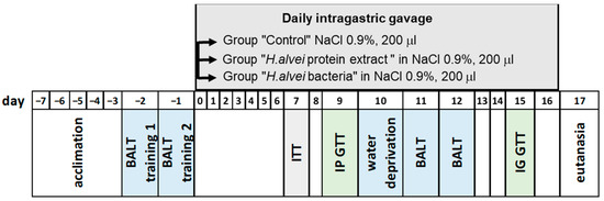 Before starting the probiotic treatment, mice were isolated for 7 days in individual cages and had 2 training sessions for sweet preference test (see below) at 1-day intervals (Figure 1). Then, mice recevied a suspension of H. alvei bacteria (4.5 × 107 CFU in 200 µL of saline/mouse) by intragastric gavage, or a total protein extract of H. alvei (5 µg/mouse in 200 µL of saline) daily at 4 pm for 17 days (0–16). Control group received 200 µL of saline. Taste preference for sucrose was assessed on days 11 and 12, as described below. The insulin tolerance test (ITT) was performed on day 7. Intraperitoneal and intragastric glucose tolerance tests (IP- and IG-GTT, respectively) were performed on days 9 and 15, respectively. On day 17, mouse tissues were collected under terminal sedation as described below in detail.