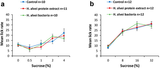 Licking responses to solutions with low and high ranges of sucrose concentrations, <4.0% (a) and <32.0% (b), respectively, in the brief-access licking test of C57BL/6J lean mice pretreated for 11–12 days via gavage with suspension of H. alvei (daily dose of 4.5 × 107 CFU/mL) or protein extract of H. alvei (daily dose 5 μg).