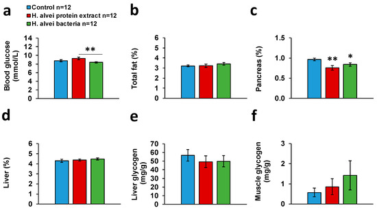 Mice displayed a stable body weight during the experiment without significant effects of the probiotic treatment on Day 17, (24.66 ± 0.33 and 24.23 ± 0.43 g after protein extract or suspension of H. alvei, respectively, vs. 24.33 ± 0.33 g for Control, one-way ANOVA: F(2, 32) = 0.58, p > 0.69). Body composition analysis revealed no significant effect of the treatment on body fat content (Figure 3b), relative liver mass (Figure 3d), and glycogen content in the liver and muscle (Figure 3e,f). However, the relative mass of the pancreas was reduced by about 21% in mice receiving H. alvei protein extract and by about 13% in mice receiving H. alvei bacteria as compared to the control group (one-way ANOVA: F(2, 32) = 5.25, p < 0.011; Control vs. H. alvei extract p < 0.0086, control vs. H. alvei bacteria p < 0.05, Tukey HSD post hoc tests, Figure 3c).