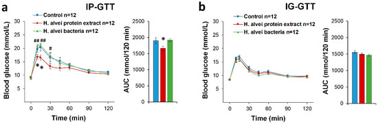 Treatment of mice with probiotics potentiated plasma glucose clearance when glucose was injected intraperitoneally (IP-GTT) as confirmed via two-way ANOVA: effect of probiotic F(2, 31) = 4.50, p < 0.02; effect of time F(7, 217) = 118.94, p < 0.00001; probiotic × time F(14, 217) = 3.22, p < 0.0002. Post-hoc comparisons showed that only the bacterial protein extract improved glucose tolerance (Figure 4a). The effect of gavage with bacterial protein was further analyzed via comparisons of AUCs, showing a significant glucose-lowering effect of the H. alvei protein extract (Figure 4a). In IG-GTT, pretreatment with either the bacterial suspension or the protein extract of H. alvei did not show significant effect on plasma glucose levels (Figure 4b).
