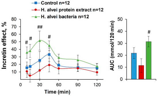 Whether probiotics may influence the so-called ‘incretin effect’, i.e., involve secretion of insulin-stimulating intestinal hormones resulting in enhanced anti-hyperglycemic response, was estimated by comparing the plasma glucose levels obtained during IG- and IP-GTT [22]. Figure 5 illustrates such an ‘incretin effect’ presented as % of differences between IP and IG vs. 100% IG glucose levels as a maximal “incretin effect”. Mice receiving H. alvei bacterial suspension displayed a visibly elevated “incretin effect” (ANOVA: effect of probiotic F(2, 32) = 4.48, p < 0.02; effect of time F(6, 192) = 3.22, p < 0.005; probiotic × time F(12, 192) = 1.02, p > 0.42), which was significant for AUC as compared to the H. alvei protein group (Figure 5).
