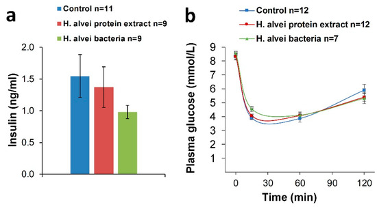 Effect of intragastric administration of H. alvei bacterial suspension and H. alvei protein extract on plasma insulin level and insulin tolerance. (a) Basal plasma concentrations of insulin after 17 days of probiotic treatment; (b) IP insulin tolerance test (ITT); plasma glucose levels after IP administration of insulin (1U/kg).