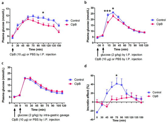 Effect of acute IP administration of 10.0 μg of the recombinant ClpB protein on plasma glucose in mice in basal conditions (a) or during the IP-GTT (b) and IG-GTT (c). ‘Incretin effect’ is shown as the % of differences of plasma glucose between IP and IG vs. 100% IG glucose levels (d). 2-way ANOVA, Bonferroni, post-tests * p < 0.05, *** p < 0.001, n = 8 for both groups.