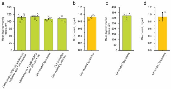 First of all, we synthesized liposomes composed of egg phosphatidylcholine/cholesterol (70/30, mol/mol). Then, we encapsulated either doxorubicin (Dox) hydrochloride [43] or clodronic acid (CA) [44]. These two synthetic procedures were carried out differently. Dox loading was conducted on preformed liposomes fabricated via extrusion through a membrane with a 200 nm pore size. The loading was facilitated due to a transmembrane ammonium sulfate gradient, which was achieved via buffer exchange. For further experiments, a part of the Dox-loaded liposomes was also labeled with Cyanine7.5 amine (Cy7.5). According to a DLS analysis, the liposomes exhibited narrow size distributions with mean hydrodynamic radii of 115.0 ± 3.4 nm for the preformed liposomes in the ammonium sulfate, 117.8 ± 2.7 nm for the liposomes after the buffer was exchanged for 10 mM HEPES supplemented with 10% sucrose, 109.4 ± 2.2 nm for the Dox-loaded liposomes, and 110.7 ± 6.1 nm for the Cy7.5-labeled Dox-loaded liposomes (Figure 1a). The resulting liposomes also showed a high Dox encapsulation of 0.93 ± 0.05 mg/mL (Figure 1b). Furthermore, parallel Cy7.5 incorporation did not seem to affect the Dox encapsulation efficiency. On the other hand, the CA-loaded liposomes were prepared via sonication of the same lipids in the presence of dissolved CA. According to the DLS, these liposomes exhibited a larger size and a narrow size distribution, as their hydrodynamic radius was 320.8 ± 29.8 nm (Figure 1c); the mean clodronate content was found to be 0.94 ± 0.12 mg/mL (Figure 1d).