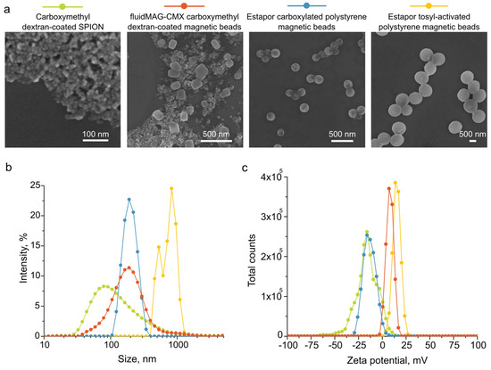 Characterization of magnetic particles. (a) Scanning electron microscopy images. (b) Diameters and (c) zeta potentials according to dynamic light scattering analysis.