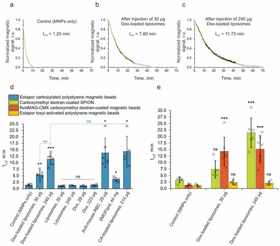 Measurements of the circulation time of MNPs in the bloodstream using the MPQ method. (a–c) Representative circulation kinetics for Estapor carboxylated polystyrene magnetic beads only and 24 h after administration of 30 and 240 µg Dox-loaded liposomes. Black dots correspond to the magnetic signal in a range of 0.9–0.1, and grey corresponds to ranges of 1.0–0.9 and 0.1–0. Green lines are the exponential fitting curves for 0.9–0.1 data points that were used to calculate the circulation half-life time (t1/2). (d) Half-life times of Estapor carboxylated polystyrene magnetic beads in a bloodstream: 24 h after injection of doxorubicin (Dox)-loaded liposomes, liposomes without Dox, and Dox; 12 h after injection of anti-mouse RBC antibodies; 1 h after injection of SMOFlipid; and 48 h post-injection of clodronic acid (CA)-loaded liposomes. (e) Half-life times of different magnetic nanoparticles in the bloodstream after injection of Dox-loaded liposomes. Control mice were injected with MNPs only. The number of animals was at least n = 5 for each group. Statistical significance for different circulation prolongation methods relative to the negative control (corresponding to MNPs only) is shown in black (d,e), while statistical significance in comparison to the 240 µg Dox-loaded liposomes is shown in blue. A p-value ≤ 0.05 was considered to be statistically significant (ns—p > 0.05; *—p ≤ 0.05; **—p ≤ 0.01; ***—p ≤ 0.001).