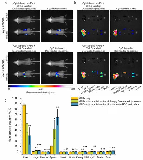 Study of the biodistribution of nanoparticles. Representative merged brightfield and Cy5 or Cy7.5 channel images revealing (a) in vivo and (b) ex vivo biodistribution of MNPs (Estapor carboxylated polystyrene magnetic beads) and Dox-loaded liposomes. Mice were injected i.v. with Cy7.5-labeled Dox-loaded liposomes 24 h before injection of Cy5-labeled magnetic nanoparticles, or injected separately with Cy7.5-labeled Dox-loaded liposomes or Cy5-labeled MNPs. Non-injected mice were used as control. (c) Analysis of MNP biodistribution using the MPQ method with Estapor carboxylated polystyrene magnetic beads only, and after administration of 240 µg Dox-loaded liposomes and anti-mouse RBC antibodies. The number of animals was n = 3 for each group. Statistical significance for different circulation prolongation methods is relative to the negative control (corresponding MNPs only). A p-value of ≤ 0.05 was considered to be statistically significant (ns—p > 0.05; *—p ≤ 0.05; **—p ≤ 0.01; ***—p ≤ 0.001.