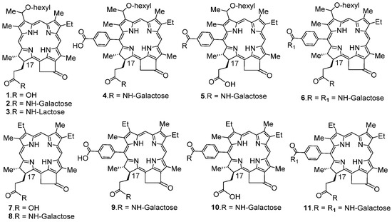 Chemistry: HPPH and the corresponding 17 and/or 20 β-galactose analogs (with and without a hexyl ether side chain at position-3) were synthesized by following our own methodology [39,40]. The structures of the compound are shown in Figure 1.