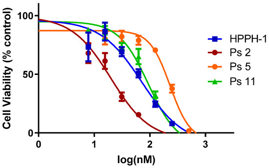 - In vitro photosensitizing efficacy: The in vitro data suggest that the addition of carbohydrate moieties to HPPH changes the biological activity in multiple ways; one of the most immediate and evident changes to the biological function of these derivatives is the change in overall lipophilicity. This in part governs the uptake, retention, and localization of the molecule which can substantially alter the PDT efficacy. To evaluate the in vitro efficacy of these compounds, the PSs were incubated in PC3 cells (known for overexpression of Gal-3) for 24 h and the photosensitizing efficacy of each PS was determined by the MTT assay. The IC50 values of HPPH were compared with a series of photosensitizers. The results summarized in Table 1 and Figure 2 indicate that among all the compounds, the HPPH conjugated with a b-galactose moiety at position 172- showed the best efficacy.