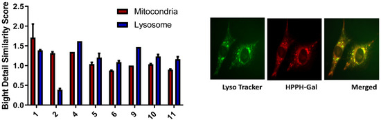 - Subcellular localization of HPPH and the corresponding carbohydrate analogs: The subcellular localization of a PS is an important property that is highly dependent on its chemical structure [41]. Previous studies have suggested that mitochondrial vs. lysosomal localization leads to two very different cell death pathways: localization of the PS in the mitochondria leads to cytochrome release and photoinduced necroptosis, while targeting the lysosome has been connected to autophagy [42]. To determine how galactose conjugation changes how HPPH localizes in the cell, the cells were visualized using an Amis Imagestream Mkit. HPPH has previously been shown to have a slight preference for mitochondrial localization in other cell lines, but in PC3 cell lines, there is no preference. The addition of a galactose moiety to HPPH either at the 17 or 20 position alters the localization dramatically. This observation is possibly due to Gal-3 receptor-mediated endocytosis and lysosomal localization. The subcellular localization of the representative galactose-conjugate 2 follows a similar distribution of HPPH, preferring the mitochondria over the lysosome. The mitochondrial bright detail similarity score observed from 2 was three times higher than the lysosomal detail similarity score. On the other hand, the HPPH mitochondrial bright detail similarity score was only 1.5 times greater than the lysosomal bright detail similarity score. Meanwhile, PS 11, the other galactose-conjugated photosensitizer which showed a high degree of PDT efficacy, slightly prefers the lysosome over the mitochondria (Figure 3). A similar trend was also observed in the other carbohydrate analogs.
