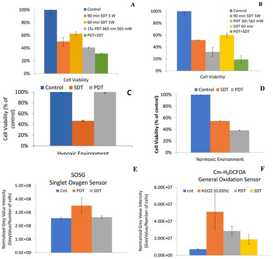Two dyes were used to determine reactive oxygen species generation in vitro. CM-DCFDA was used to determine general ROS production within the cell as a result of PDT or SDT. The cells were plated in 6-well plates and allowed to adhere. Approximately 5 µM of the photosensitizer was used. Approximately 2 h before PDT or SDT, the cells were washed with PBS, and serum-free media were added with 10 µM of Cm-DCFDA added. The cells were then washed to remove excess DCFDA and exposed to either PDT or SDT. After ROS induction, positive control H2O2 was added to 0.03%. The plates were immediately imaged using a fluorescent microscope. The results were graphed comparing the fluorescence per cell in the test wells to a negative background control.