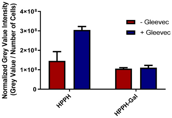 Figure 5. Intracellular uptake of HPPH and HPPH–Gal with and without the presence of Gleevec, a tyrosine kinase inhibitor.