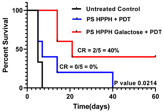 - Compared to HPPH 1, HPPH–Galactose 2 showed improved PDT efficacy in vivo: The PDT efficacy of both the PSs was investigated in SCID mice bearing PC3 tumor xenografts. When the tumor was around 200–250 mm3 in size, each PS was injected at a dose of 0.47 mmole/kg, and at 24 h post injection, the tumors were exposed to light (135 J/cm2; 75 mW/cm2) (two sets of experiments; five mice/group). Tumor growth was monitored daily. The results summarized in Figure 6 indicate that the tumor regrew in all mice treated with HPPH-PDT at day 60, and the mice were euthanized. Under similar treatment parameters, HPPG–Gal 2 showed improved long-term cure, and 2/5 mice were tumor-free on day 60. These results suggest that the presence of a galactose moiety at the appropriate position of the macrocycle and also the overall lipophilicity maintained by introducing a hexyl ether side chain at position 3 made a significant difference to the biological efficacy in vivo. This was a proof-of-principle study, and the treatment parameters are currently being optimized.
