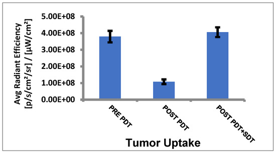 Figure 7. Tumor (PC3) uptake (determined by fluorescence (excitation wavelength: 665 nm; emission wavelength: 720 nm) of HPPH (0.47 µmol/kg) at 24 h pre PDT, post PDT, and then at 24 h SDT in SCID mice (3 mice/group). Light dose: 135 J/cm2, 75 mW/cm2, for 30 min. US dose: 2 W/cm2 for 30 min.