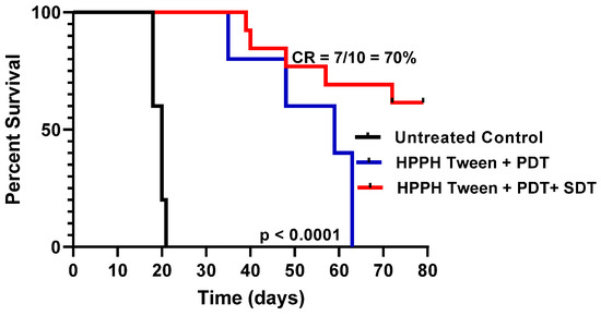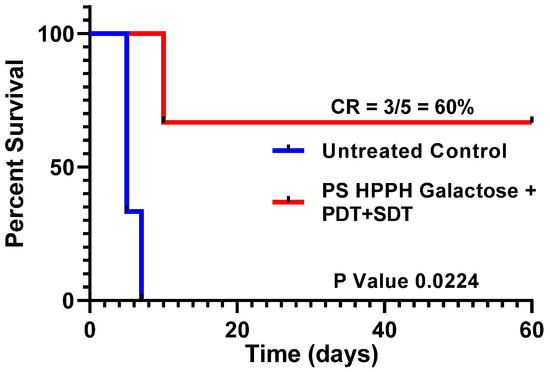 Statistical Analysis: The standard log-rank test (Mantel–Cox) was used for statistical analysis. It is a hypothesis test to compare the survival of the animal/tumor cure based on the Kaplan–Meier survival curve. It is a test significant for detecting differences between groups to confirm if one group has a risk of an event greater than the other. For analysis of the in vivo PDT/SDT efficacy cure rate, the survival curves were plotted using the drug dose over tumor regrowth. The in vivo experiments discussed in this manuscript were performed in compliance with all state, local, and federal laws and the PHS Policy on the Human Care and Use of Laboratory Animals. This study was conducted in an AAALAC-accredited facility, following the IACUC-approved animal protocol.